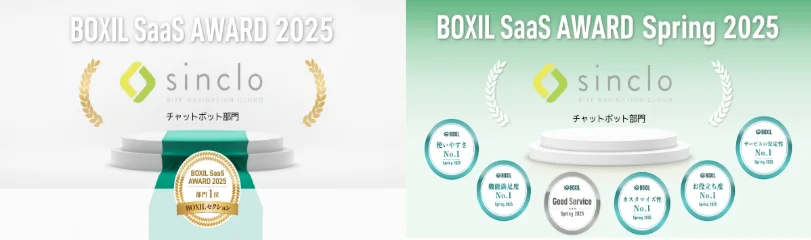 「BOXIL SaaS AWARD 2025」で「sinclo」が受賞したBOXILセクションのチャットボット部門1位は、2024年中に「BOXIL」上へ新たに投稿された口コミ評価の総得点が、各部門で最も高いサービスに対して付与されるものです。また、「BOXIL SaaS AWARD Spring 2025」で受賞したチャットボット部門の「Good Service」は、「BOXIL」上に投稿された口コミを対象に、各カテゴリで総得点の高いサービスに対して付与されるものです。その他、「使いやすさNo.1」「お役立ち度No.1」「機能満足度No.1」「サービスの安定性No.1」「カスタマイズ性No.1」は、「BOXIL」上に投稿された「口コミによるサービス評価」9項目を対象に、各カテゴリ、各項目において一定の基準を満たした上で、最も高い平均点を獲得したサービスに対して付与されるものです。